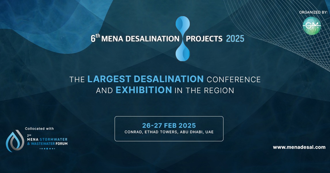 The 6th MENA Desalination Projects Forum, which is scheduled on 26 – 27 February 2025 at Abu Dhabi, United Arab Emirates, is the largest government-endorsed regional desalination conference. It brings together over 400 regional and international stakeholders from the government, consulting, contracting, and technology sectors to discuss the way forward for the region’s desalination industry, key upcoming mega projects, and national sustainability visions driving the region’s strategic water agendas.