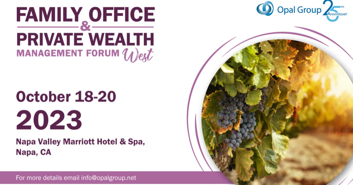 Come and join Opal Financial Group's Annual Family Office & Private Wealth Management Forum - West. Known for the fastest growing population of newly structured family offices in the world, Northern California is largely dominated by first and second-generation families from the Silicon Valley. Investment strategies such as Private Equity, Venture Capital, and Technology will be familiar themes throughout this conference. Investment managers and families will come together to discuss the foundations in which they built their wealth, and uncork the various investment strategies in which to keep their portfolios growing and plentiful.