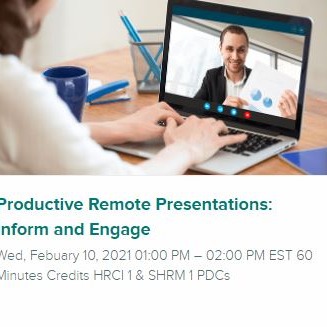 Suddenly you are working remotely and doing on-line presentations. If you are wondering how to be more effective, this webinar will give you the tools and skills to adapt both your presentation style and your materials to make powerful remote presentations. You will learn tips on how to create a pleasing visual on-line presence in your home office space, how much time to schedule for different types of presentations and the ideal number of participants for remote presentations. You will learn how to engage your audience and to manage questions and input. You will also learn tips to create or adapt your slides for a remote presentation.